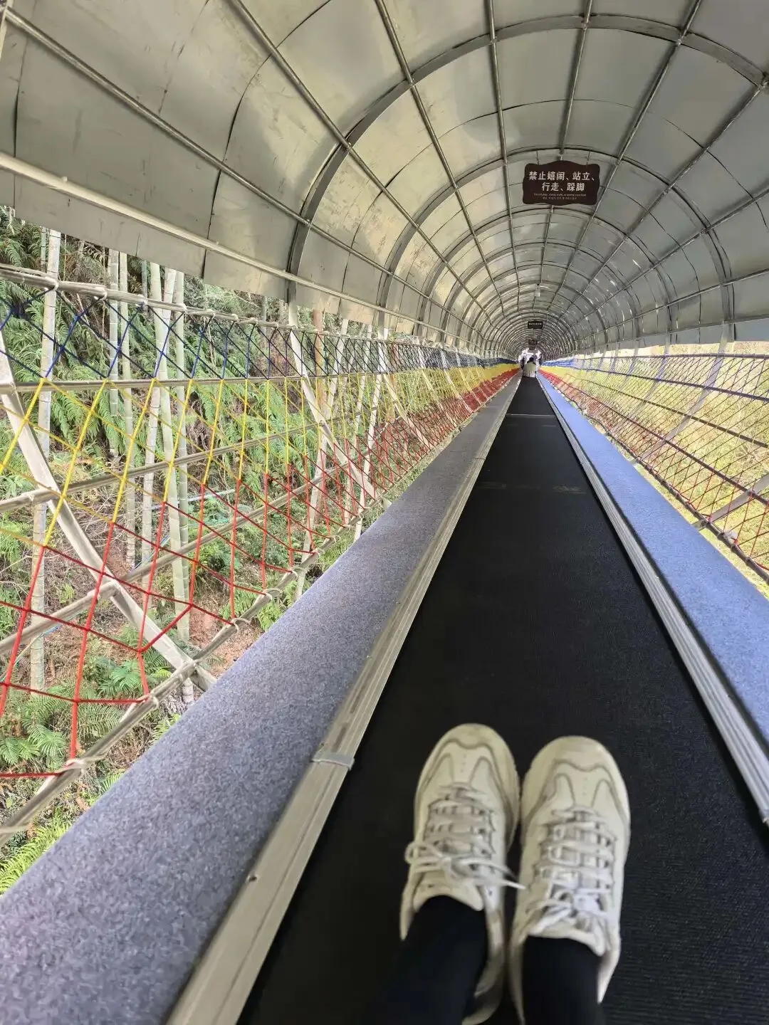 经过2级云梯,就来到了山中央,随后边是一座座山串联起来的山崖玻璃栈道,很快到了U型玻璃跳台,这里可以拍拍照。 玻璃栈道,我不敢长时间盯着脚下看,看远处不慌也不腿软。 惊险又刺激的项目,便是步步惊心,悬于两座山直接的玻璃索道,脚踩在一个个玻璃踏板上,虽然没有腿软,但是感觉真挺长的,有点微汗。尽管有伸缩挂着托住,但是每一步都相当谨慎,人类还是需要有安全感的。 好不容易走过去了,工作人员还问要不要从旁边的木质踏板走回去,不了,值回票价,体验一下就行,不必太较真。 走了挺多石台阶下山,很快到了飞龙滑道,滑下去几分钟,滑道很小,而且弯道比较多,就放弃了,直接步行大概30-40分钟。 不一会来到了一线天,是有点狭小,也看到了“五指山”,开始以为需要原路返回,没想到是直通山脚的,设计得不错。