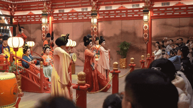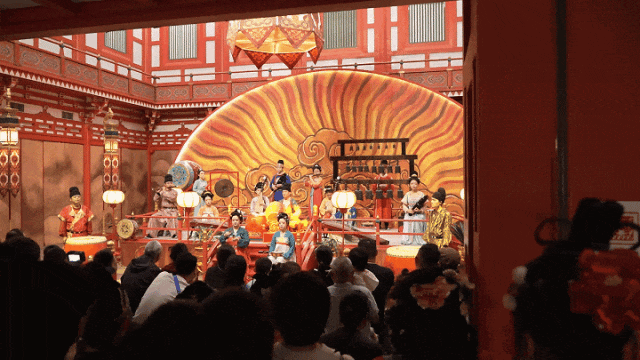 当笙箫管弦和着激昂的雷鼓声声响起,那便是非遗鼓乐演艺《大唐燕乐》开场了!曲章悦耳,余音绕梁,多种乐器交织演奏出1300年前盛唐最华美的回响。