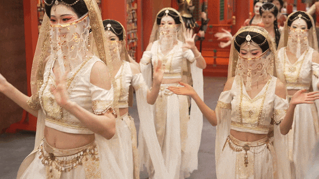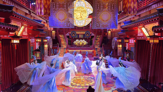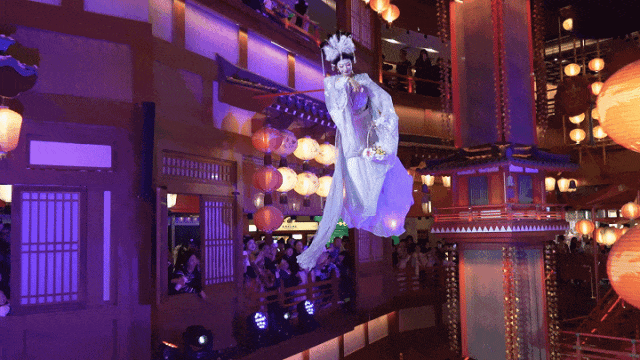 作为街区最受欢迎的演出,《霓裳羽衣舞》几乎场场座无虚席。当莲花台缓缓升起,贵妃在纱幔后露面,全场都静下来,欣赏这如梦似幻的美好。