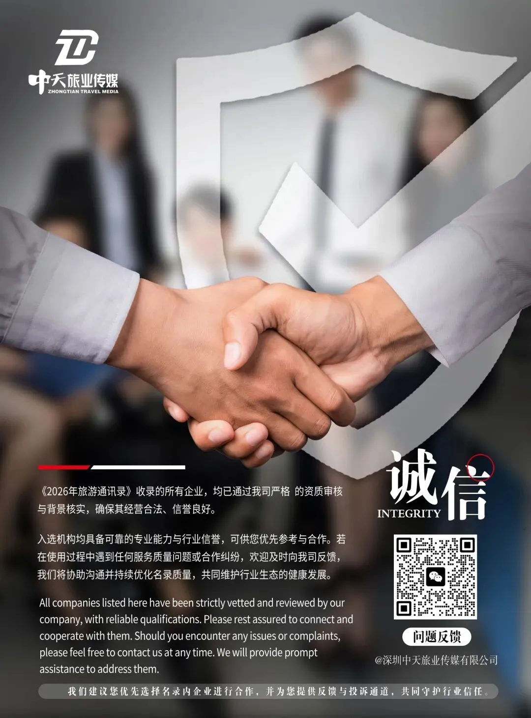 这本一年仅出一刊的行业权威名录,汇集了全球500+优质旅游资源企业,覆盖地接、酒店、景区、交通、保险、会展、签证、定制服务、旅游服务等全产业链环节,是您拓展业务、对接资源、寻找合作的年度必备工具书。
