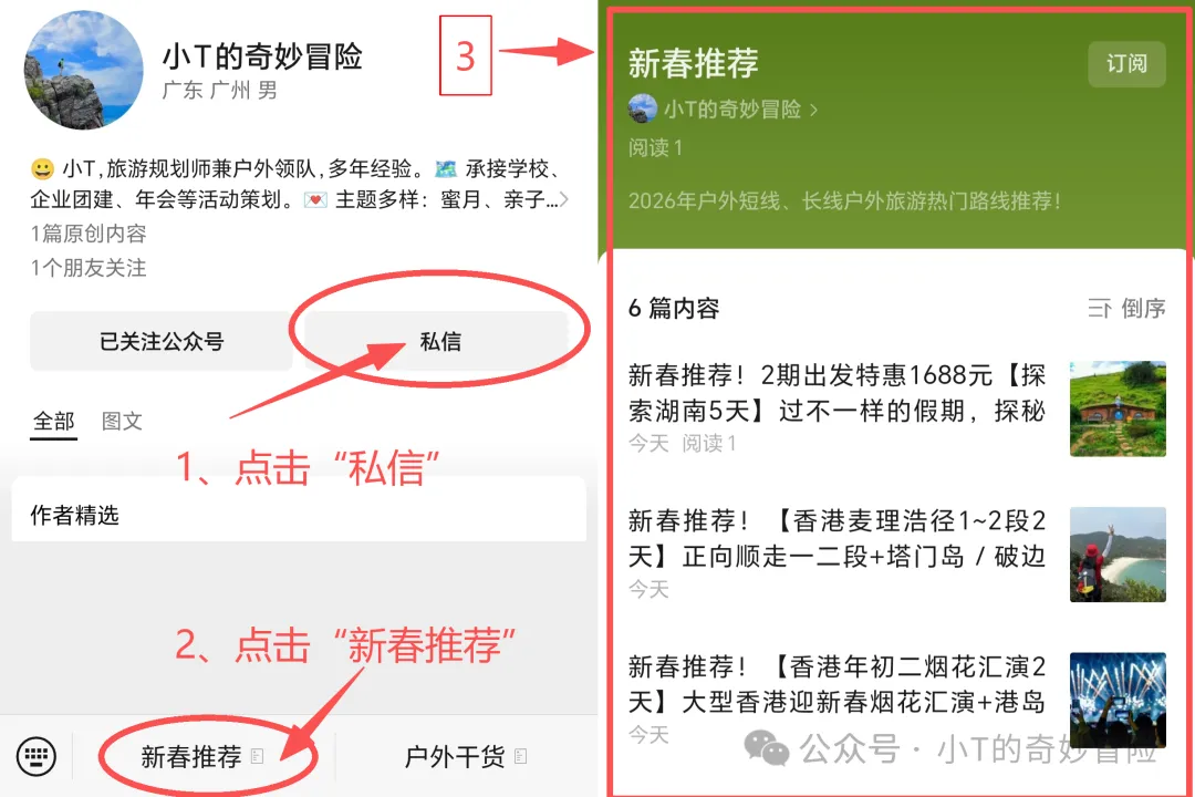 点击账号名片,关注小T的奇妙冒险,后台对话框点击菜单“新春推荐”,看热门路线(持续更新)
