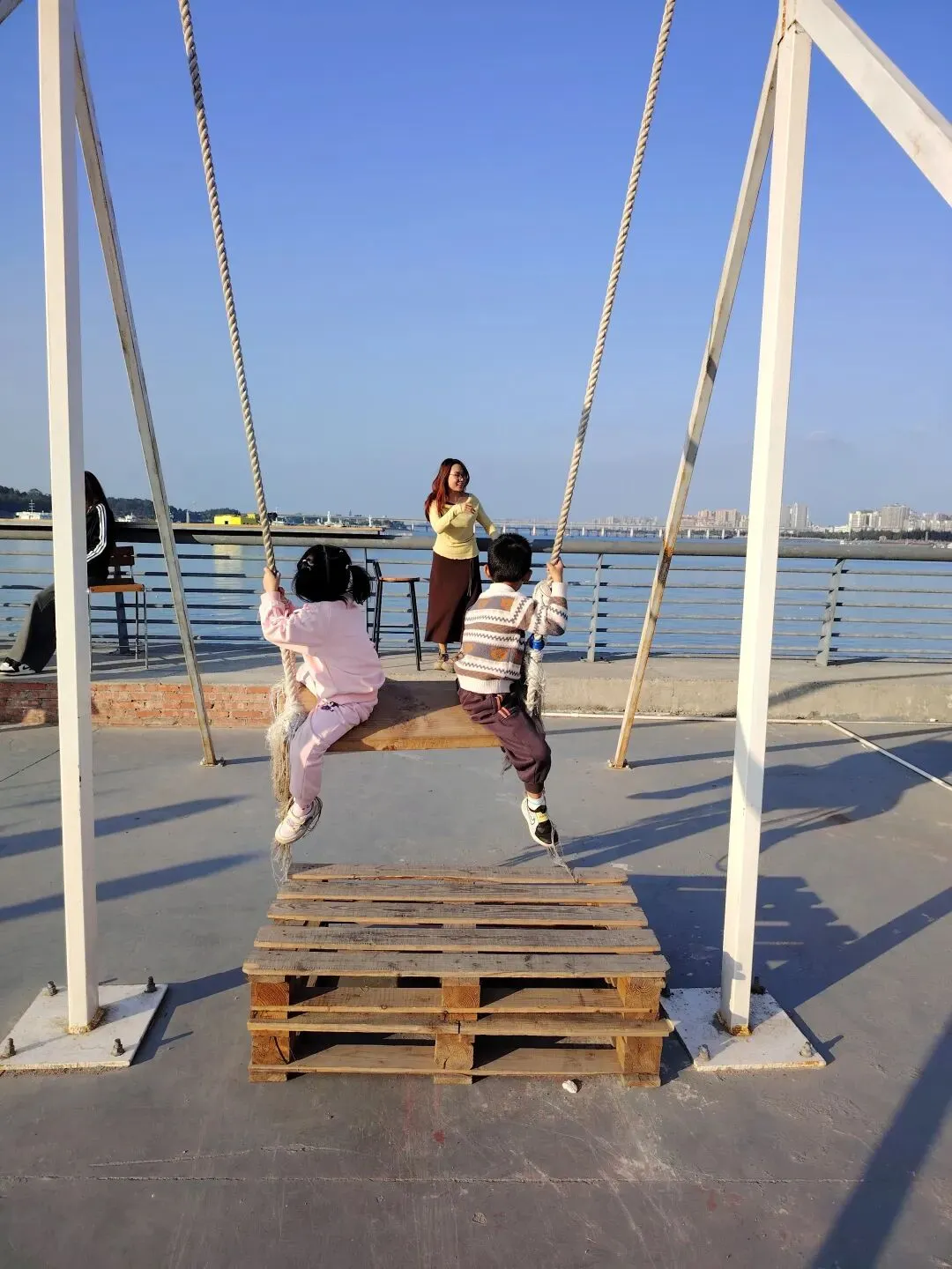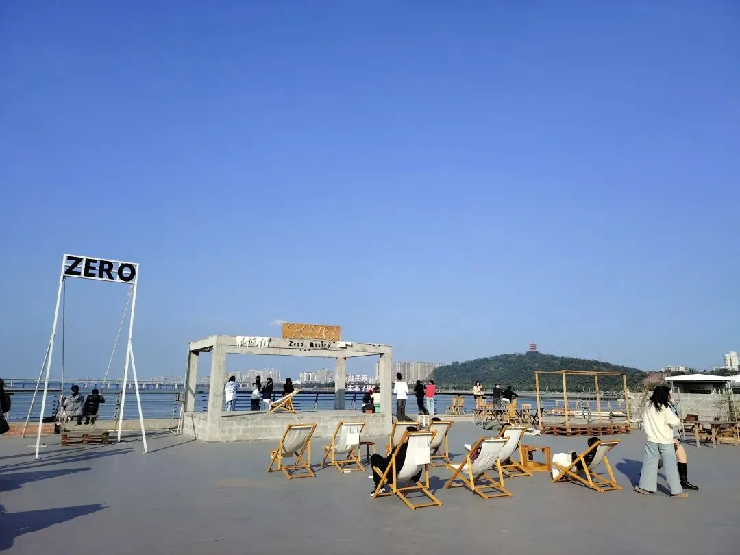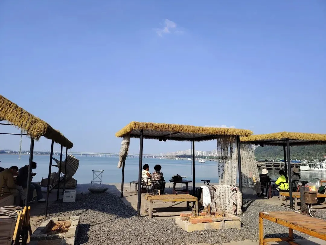 沿海散落着一些独立咖啡厅和文旅主题餐饮店,我们随后又来到一家新开不久的“零号”咖啡馆。店铺前面有一个开阔的观景台,店主贴心地准备了各式各样的座椅,方便游客休息、拍照。有不少专程来拍照的游客,尤其是年轻的女孩们,特意化了妆、穿上漂亮衣服来这里打卡。我们找了个位置坐下来休息。阳光明媚,光线特别好,我也忍不住拍了很多海景照。小雨点和小伙伴则在一旁荡秋千、追逐打闹。