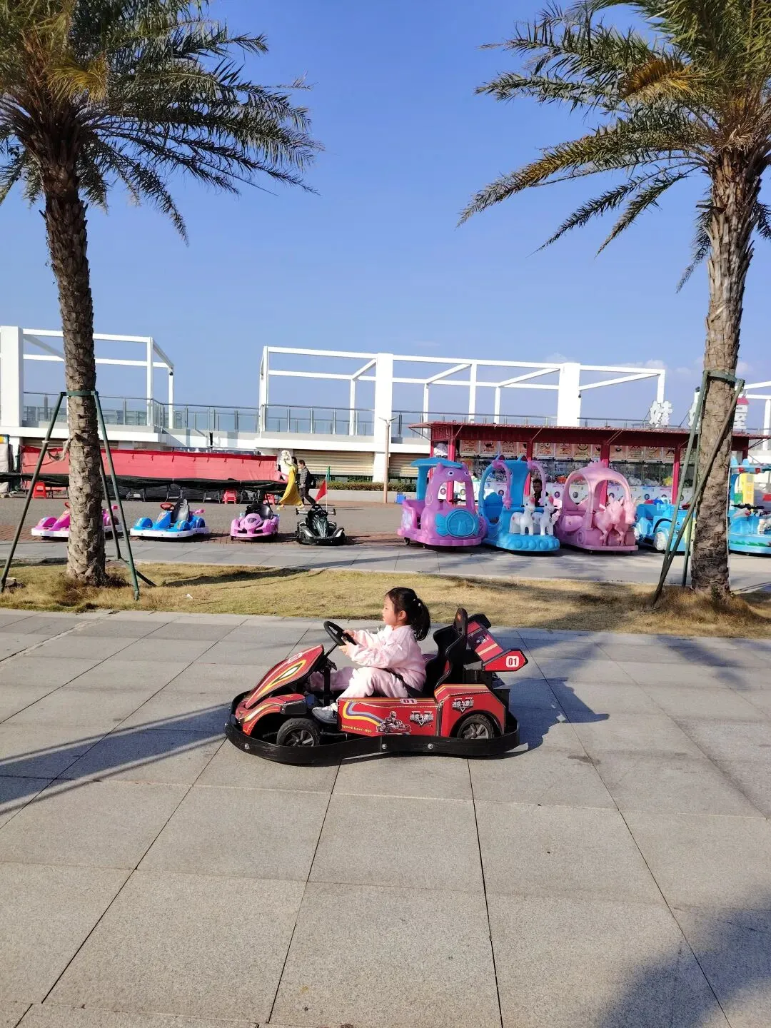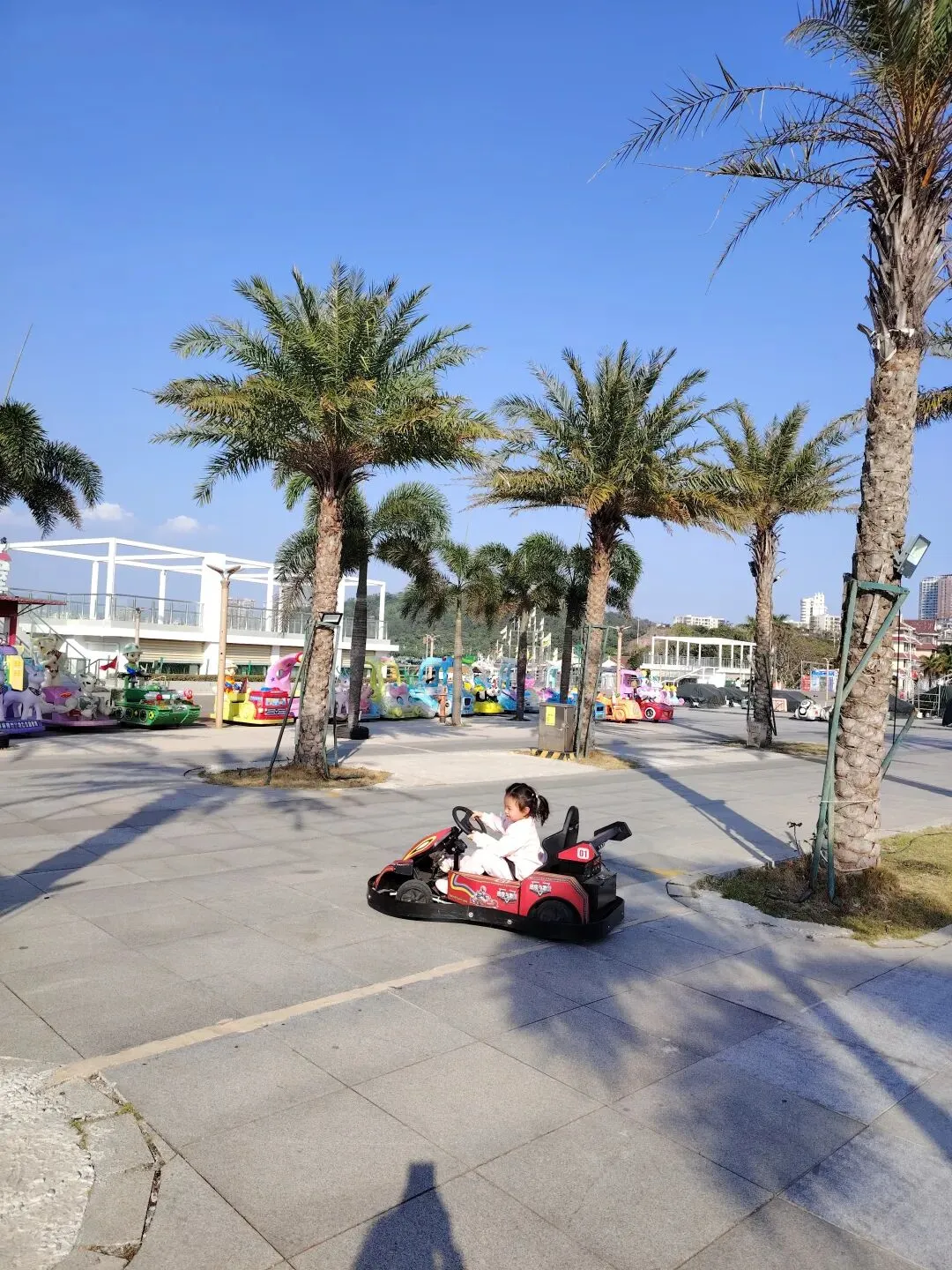 我们在海边走走停停,拍拍照,吃吃零食,很快就临近傍晚了,广场夜市的露天游乐场传来了音乐声,有的摊位已经开始营业了。两个孩子闹着要去玩,在小伙伴的带动下,小雨点也想尝试一下卡丁车。因她是第一次玩,老板特意把车速调慢了一些。刚开始她还有点紧张,开得小心翼翼,一会儿就比较熟练了,她第一次解锁这项新技能,特别兴奋,一连玩了两次才肯走。