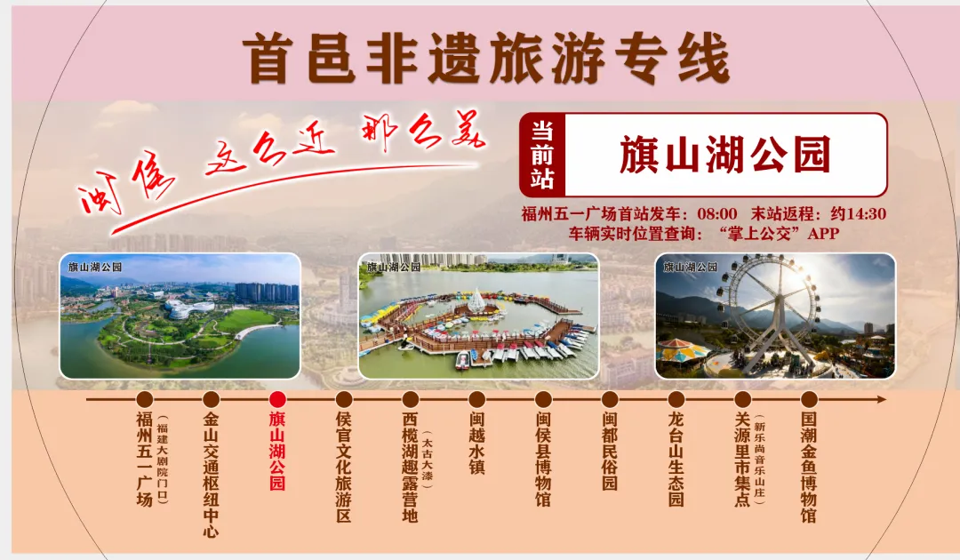 线路覆盖旗山湖公园、侯官文化旅游区、闽侯县博物馆、国潮金鱼博物馆等非遗参观点,并配备专业讲解员解读文化内涵,其余站点采用即停即走模式,兼顾游览效率与体验丰富度。