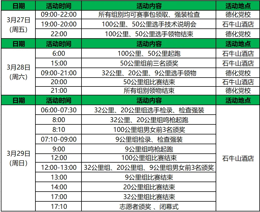 4、本次赛事将严格执行环保要求,所有补给点及起终点均不提供一次性杯子和一次性碗,请选手自备餐具(如折叠碗、折叠杯)。