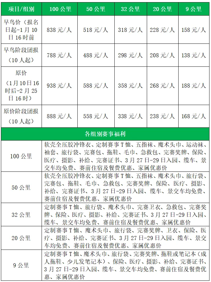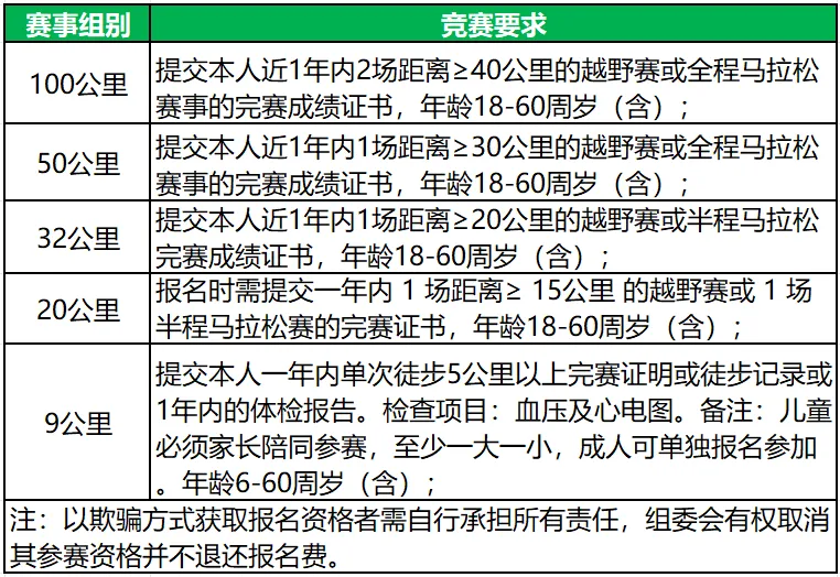 赛事组别:100KM、50KM、32KM、20KM、9KM