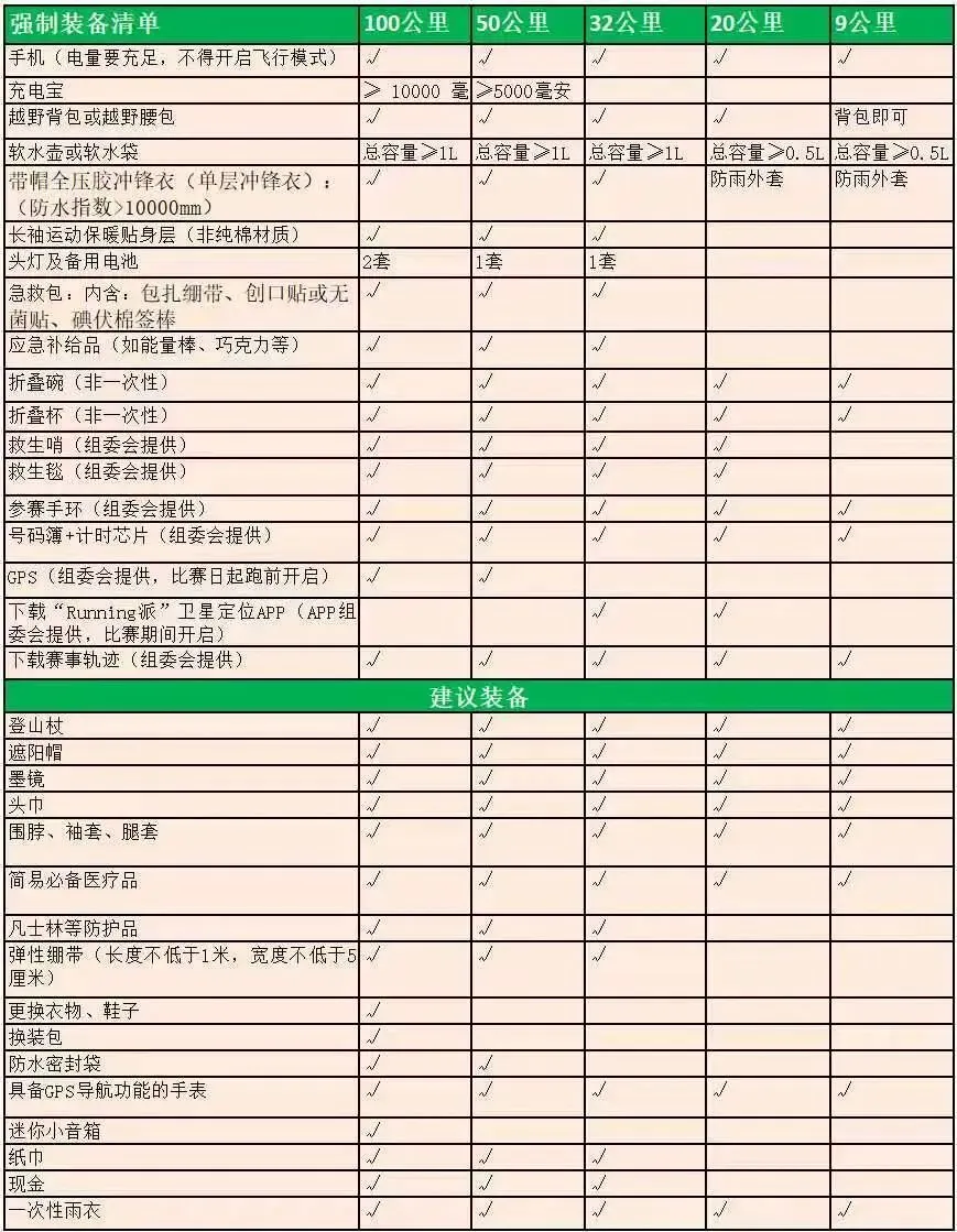 参赛者需携带下方表格内的强制装备供赛前检查(标注组委会提供的除外),并保证在赛中全程携带(以下强制装备是对于参赛者的最低携带要求,参赛者请尽量根据自身情况选用在性能上能够防风防雨及保暖的衣物以保障自己在赛道上的生命安全):