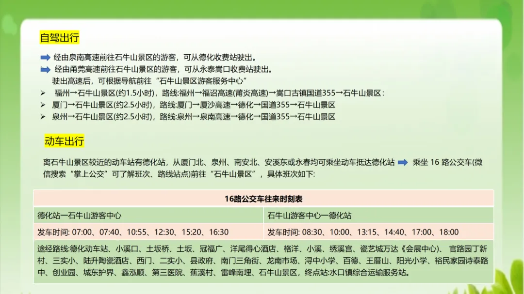 路线信息:石牛山酒店广场→竹林小栈→岱仙瀑布→油漏漈悬崖栈道→情缘谷→索道中站→榜上村→白水漈瀑布→竹林→山顶草地→峰仔面路口→石笋尖→狮头岩寺→格头尾→金牛广场→主峰制高点→太清洞→主峰酒店→索道上站→坂里省委旧址→梨坑村→溪兜→湖顶→水口镇星火基地→溪边栈道→祥光→八逞村→吾岭→谢地→水口镇→承泽→榜上村→天空之心→许愿桥→小索道旁栈道→油漏漈→竹林小栈→石牛山酒店广场;