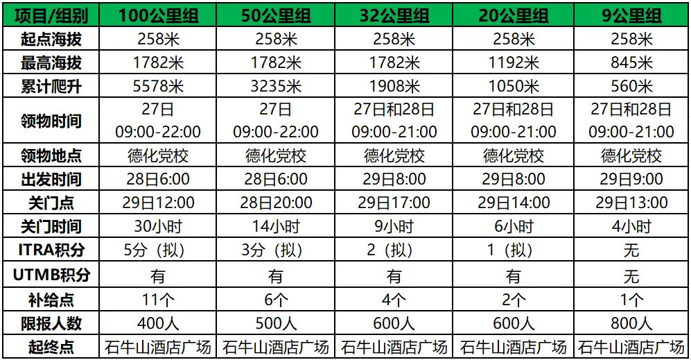 注:实际距离、爬升数据以及对应的出发时间及关门时间可能会因赛道修葺等因素进行微调。