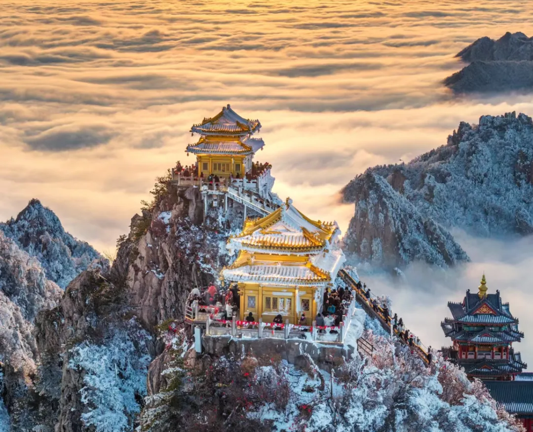 雪后金顶云海、银装素裹的景色,使这里一跃成为全国知名的冬季旅游胜地,完成了从传统山水景区到“网红第一山”的逆袭。