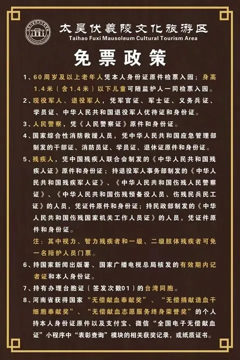 3、本免票政策仅适用于太昊陵景区门票,龙湖游船及其他二次消费项目均不在此政策适用范围之内。