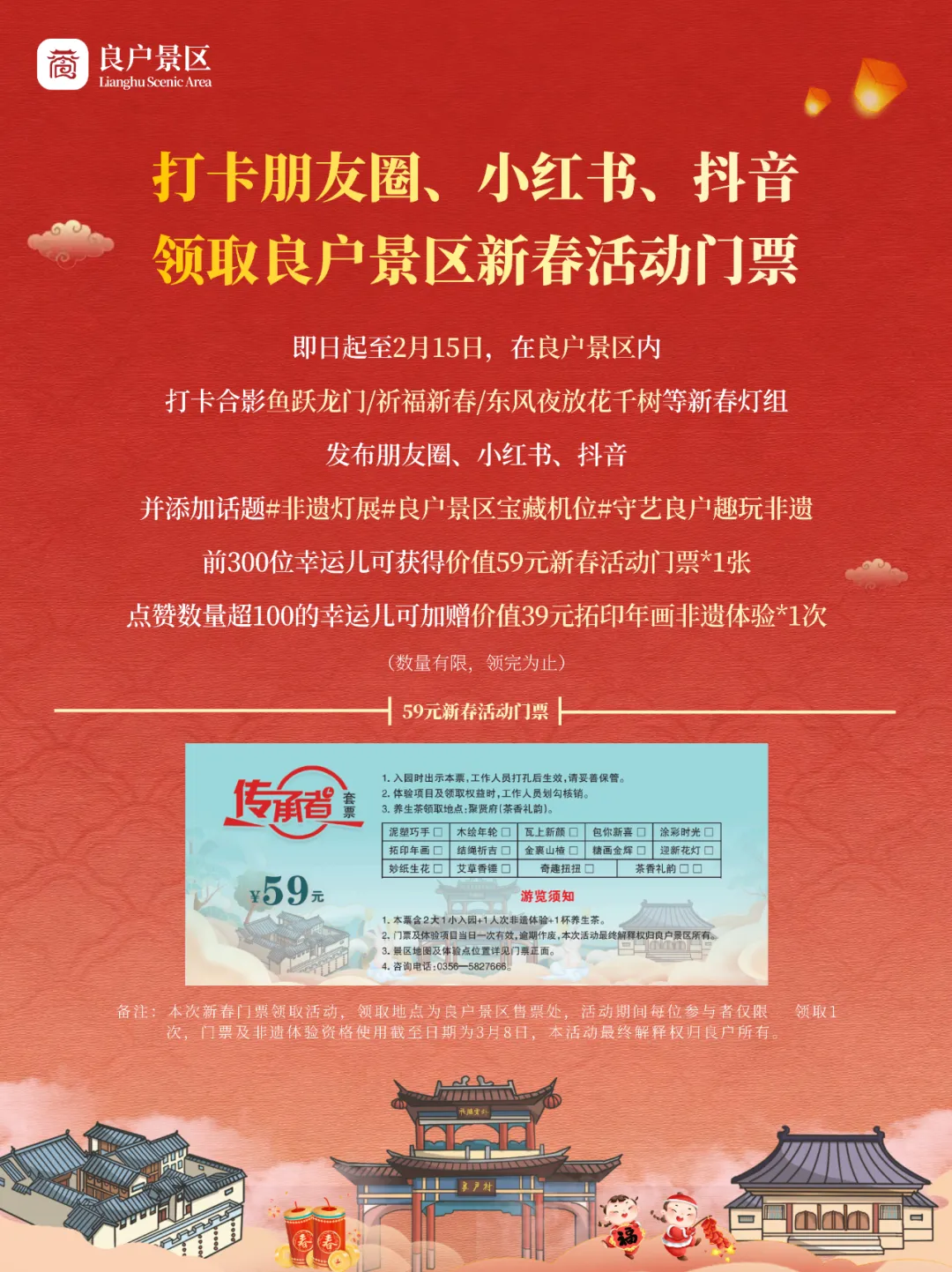 🎁福利领取:前300位发布者可获得价值59元新春活动门票1张,若发布内容点赞数量超100,还可额外获赠价值39元拓印年画非遗体验1次(数量有限,领完即止)。