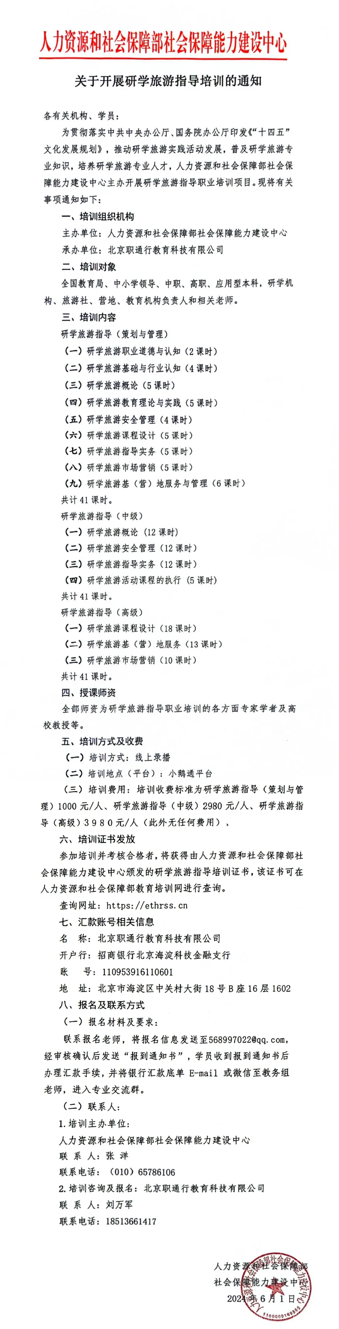 人力资源和社会保障部能力建设中心(人社部能建中心)是人社部直属事业单位,专门负责职业技能培训与认证,其颁发的《研学旅游指导》证书具有官方背书,尤其在体制内或政策相关领域认可度较高。