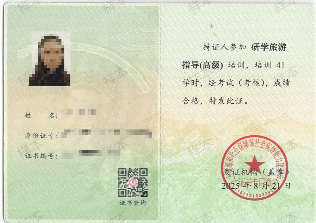 《研学旅游指导证书》由人力资源和社会保障部能力建设中心统一组织考核与颁发,加盖官方印章、全国通用,全国联网可查、终身有效,为研学导师职业发展、项目申报及岗位晋升提供了长期支持。