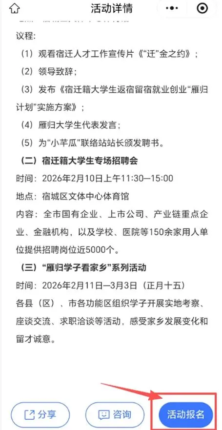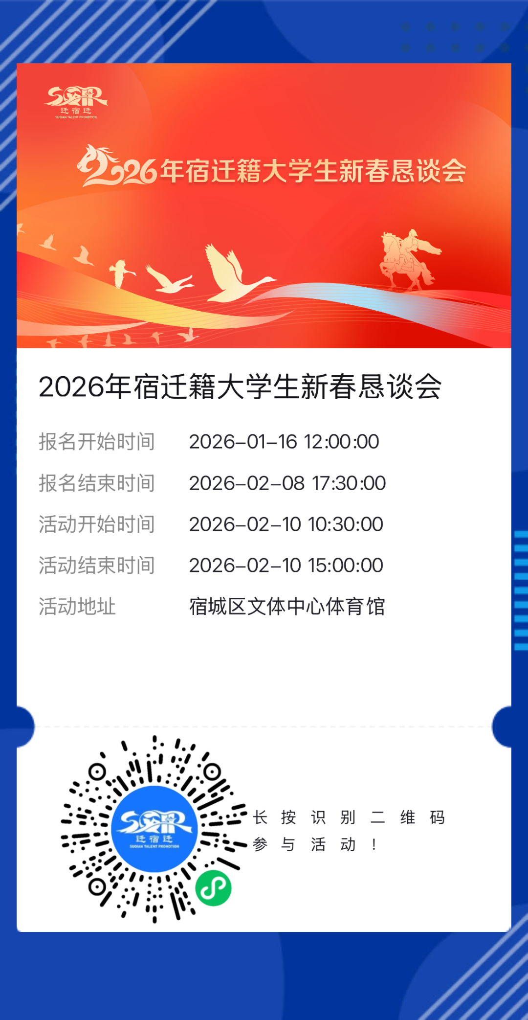 进入“宿迁人才e家”主界面、点击中间横幅,即可进入活动详情页完成报名。