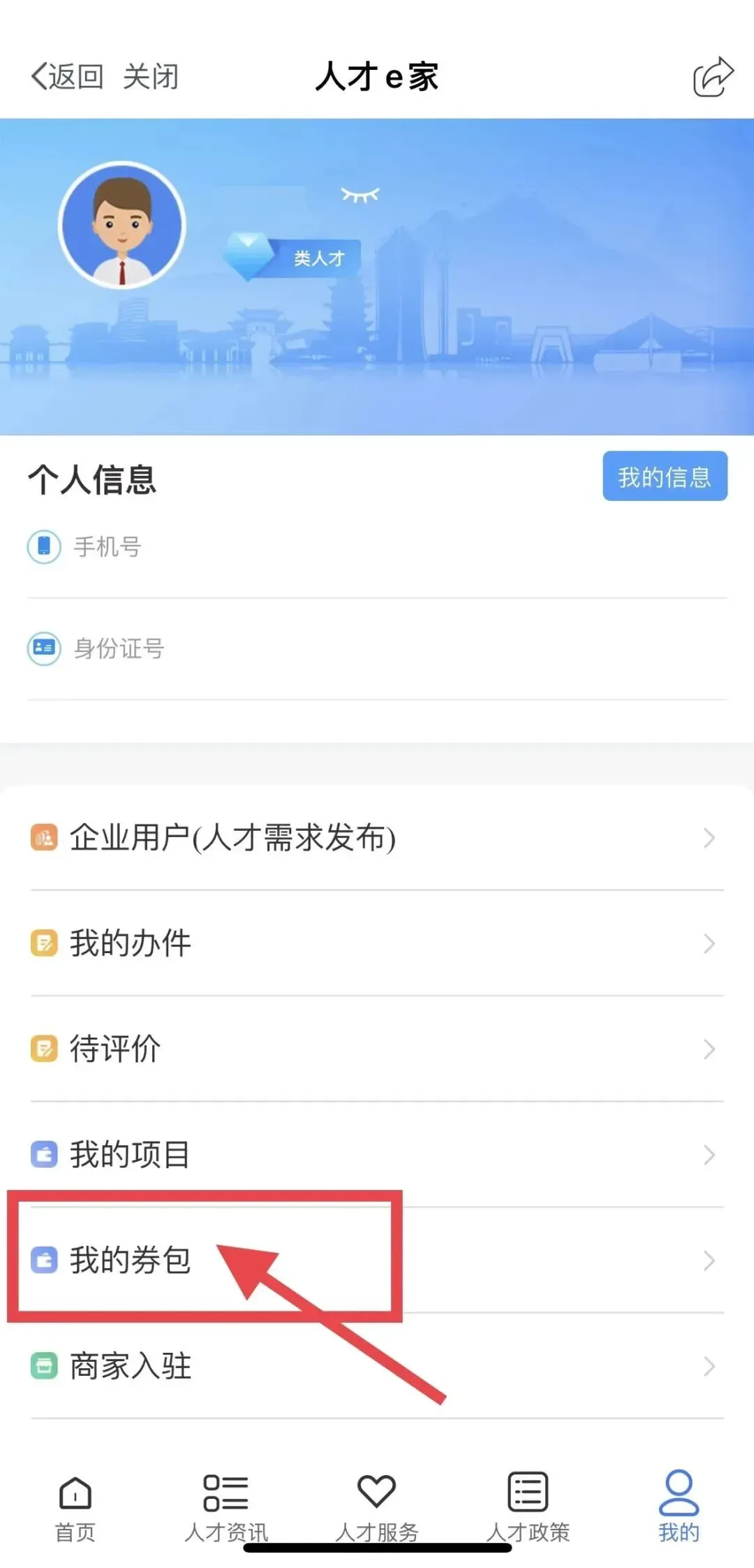点击【我的】→【我的券包】→选择【旅游券】立即使用,点击首页头像下方扫一扫,扫描景区人才入园二维码,完成优惠券核销,出示核销后的入园通行证至人工通道核验入园。