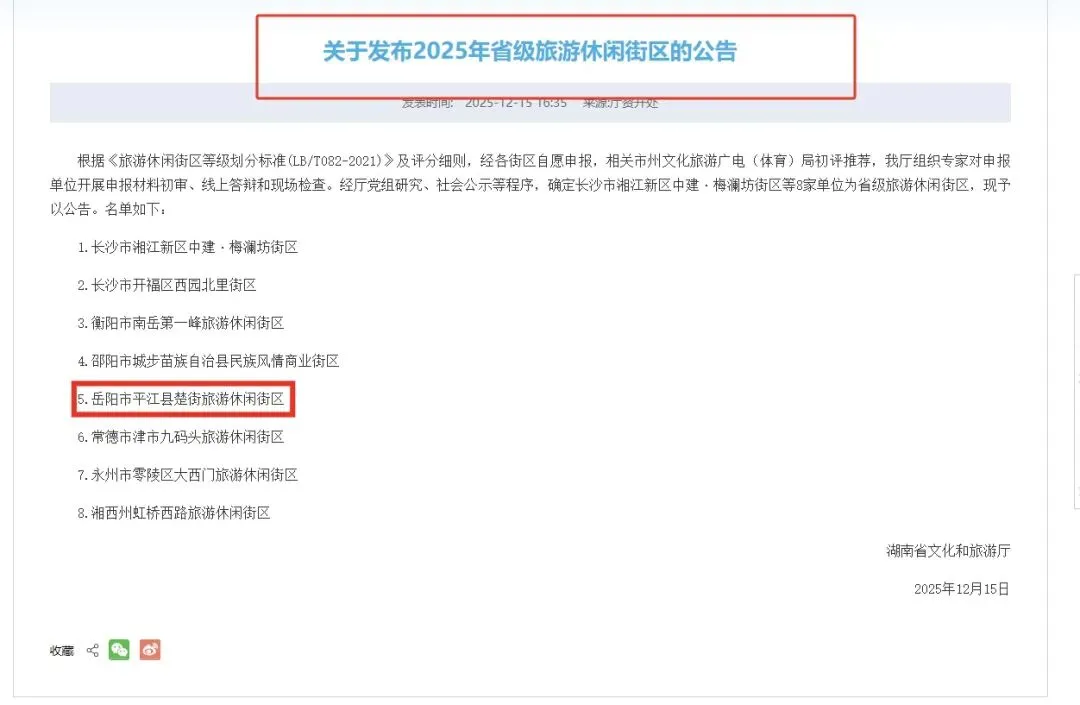 近日,我省8家单位被湖南省文化和旅游厅认定为2025年省级旅游休闲街区,其中我市岳阳平江县楚街旅游休闲街区榜上有名。