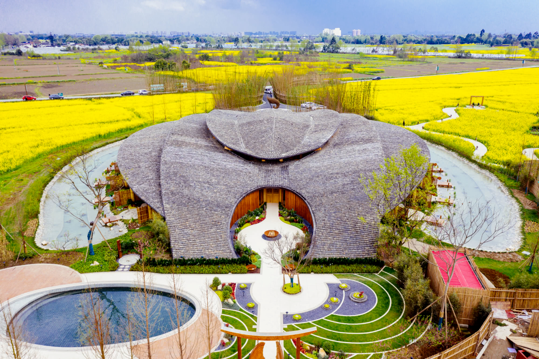 稻乡渔歌艺术中心采用传统川西林盘的田、林、水、院等形式,分布有水系、林地、湿地等自然资源,田中有林、林中有屋。在修建的过程中极大地保留了原来林盘的宅基地、保留原有林盘的原始风貌、让其自然生长。