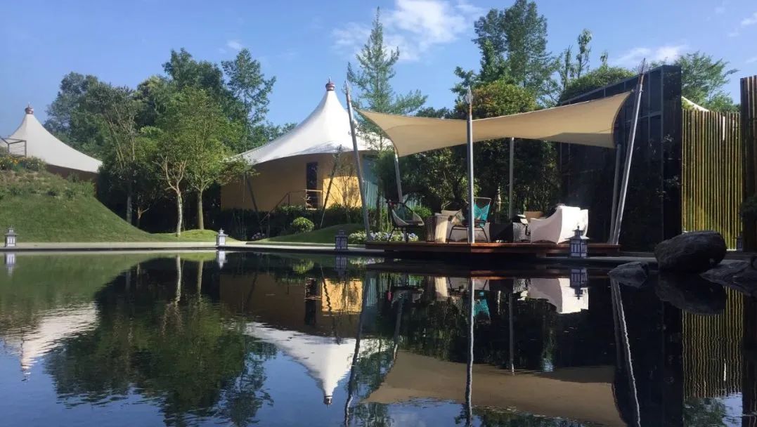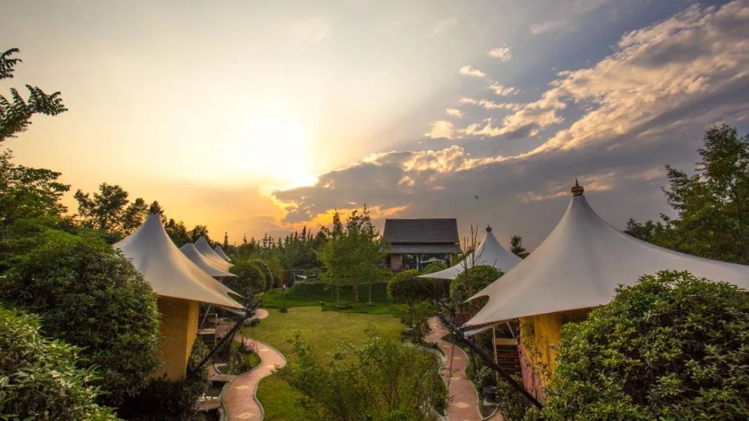 青普文化行馆·成都淼兮坐落在全国著名的桂花之乡,川派盆景发源地——成都温江区岷江村江安河心半岛上,距离青城山和都江堰这两处世遗地仅20分钟车程,它是西南首家帐篷野奢度假酒店。十顶帐篷以草坪为轴,充满韵律感地分布开来。百子莲、丹桂、绣球、紫藤、蔷薇、紫荆、结香、旱柳龙树等各类树种穿插其中,四季花开,各有韵致。