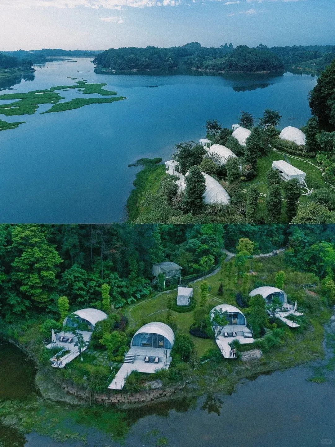 蒲江妙音湖畔,散落着几个白色的贝壳形房子,这就是住在自然歌声里的民谣里野奢帐篷酒店。这里没有钢筋水泥,没有汽笛声也没有建筑声,有的只是虫鸣鸟叫和湖光泛起涟漪的声音。揽湖抱月、听雨摘星,贝壳造型的房间沿湖边分布大大的落地窗,正对着平静的湖面天气好的时候可以躺在床上看日出。
