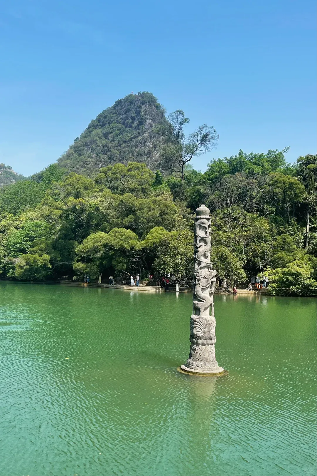 导游解说:现在我们来到了龙潭公园,它位于柳州市区南部,规划面积1084公顷,以“山青、水秀、洞奇、石美、林茂、花香”著称。公园内有“一湖二潭四谷”的独特格局,二十四峰形态各异,立于镜湖与雷龙二潭周围。