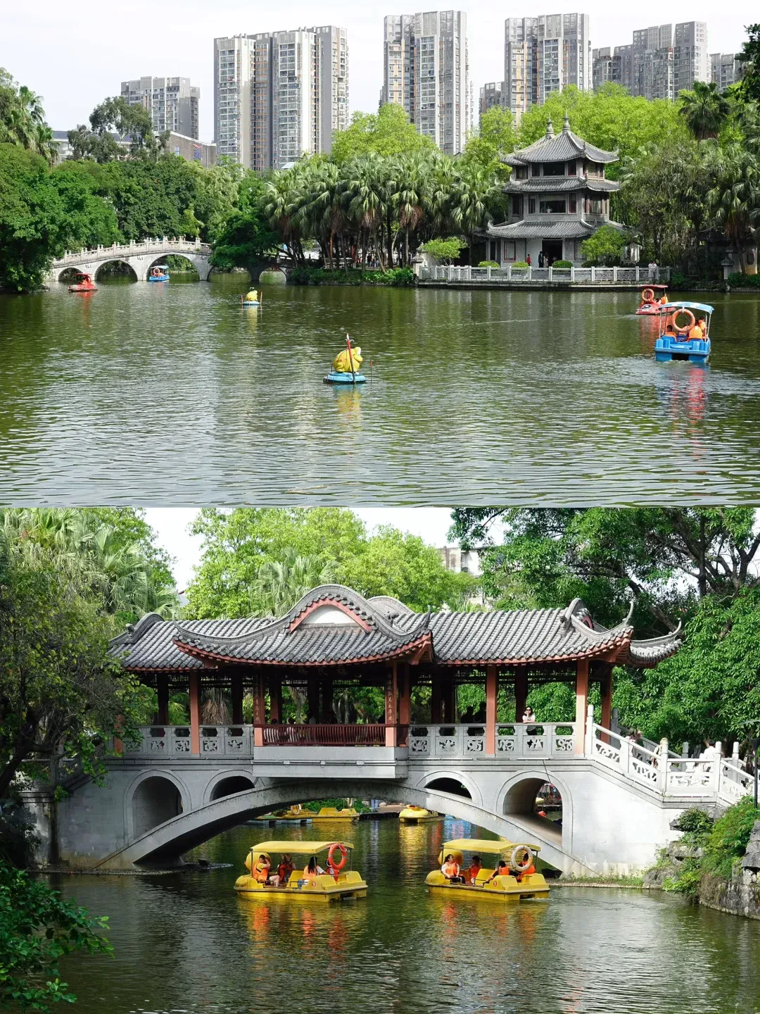 大家看,雷龙二潭水温恒定在18℃~22℃,每逢隆冬,水汽蒸腾,形成“双潭烟雨”的奇观。湖边这座仿三江程阳风雨桥而建的龙潭风雨桥,飞檐廊桥横跨镜湖,是侗族建筑艺术的代表。公园内还有柳宗元祷雨文碑亭、明代张翀钓鱼台、鲤鱼嘴贝丘遗址(新石器时代)等人文遗迹,让您在欣赏自然美景的同时,感受柳州的历史底蕴。春节期间,公园内会有民族歌舞表演,还能品尝到各种柳州特色小吃。