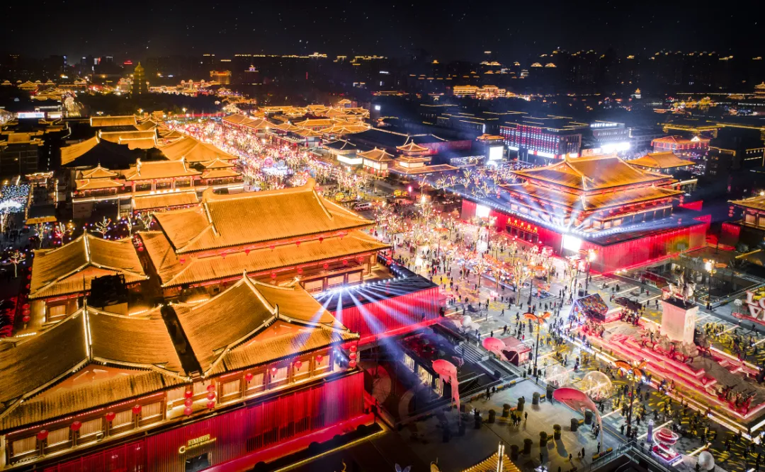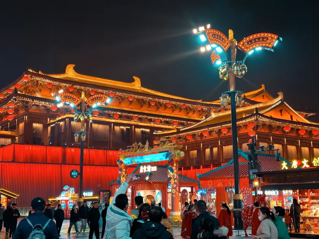 西安大唐不夜城以大雁塔为文化地标,以唐风元素为主线,融合现代流行元素,充分挖掘城市文化底蕴,构建了“一轴·两市·三核·四区·五内街”总体布局。