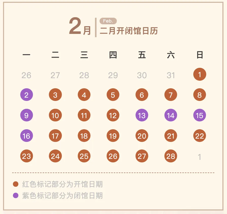 2026年2月14日(周六)至2月20日(周五)闭馆,2月21日(周六)至2月22日(周日)正常开放,2月23日(周一)常规闭馆。开馆时间为10:00-16:00(15:30停止入馆)。