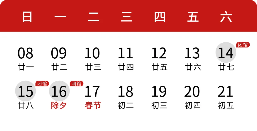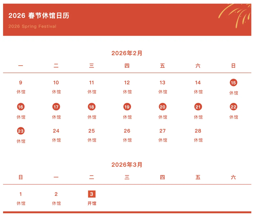 2026年2月15日(周日)至2月17日(周二),2月23日(周一)闭馆。