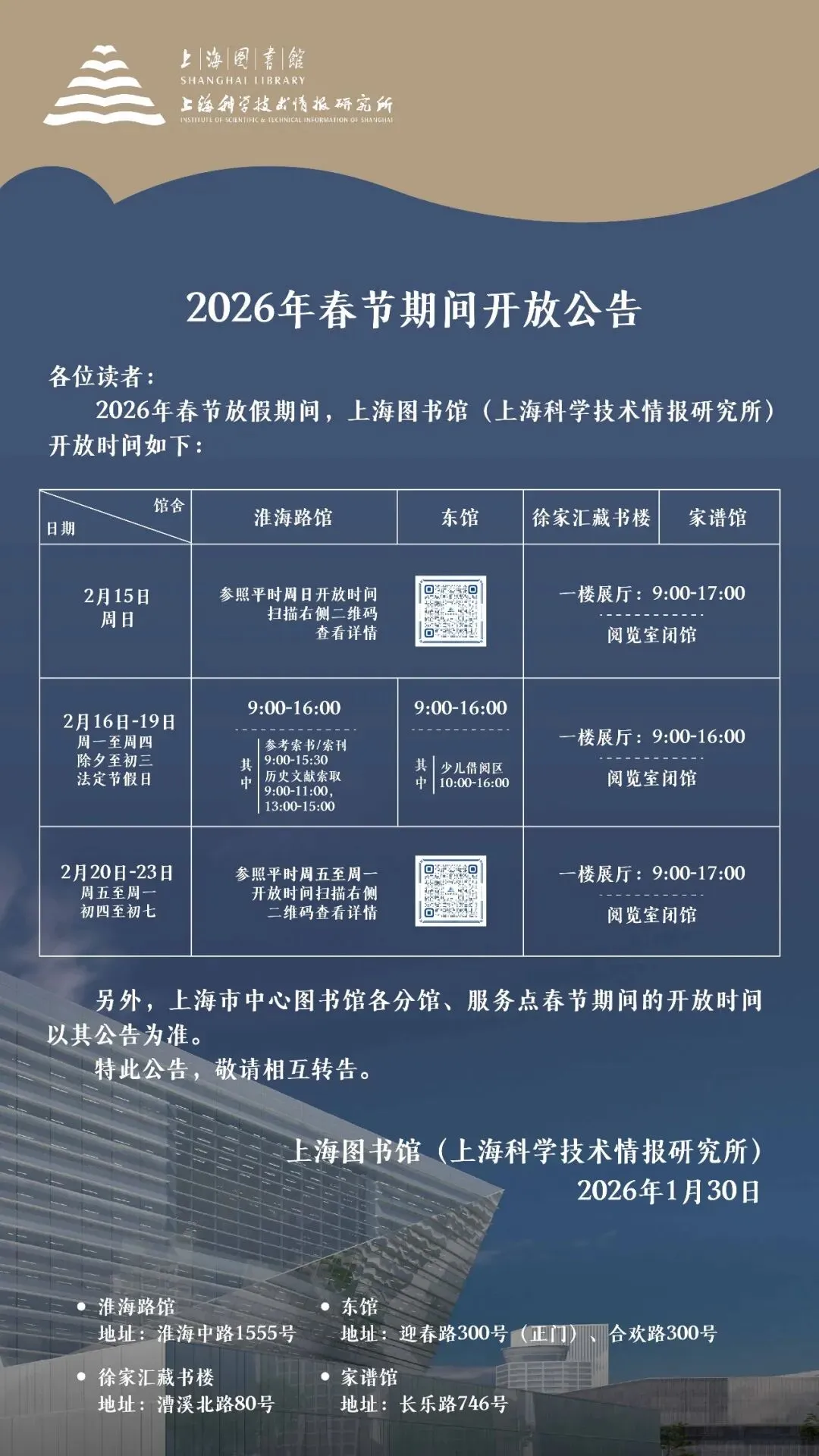 2026年春节放假期间,静安区图书馆开放时间及服务项目具体如下: