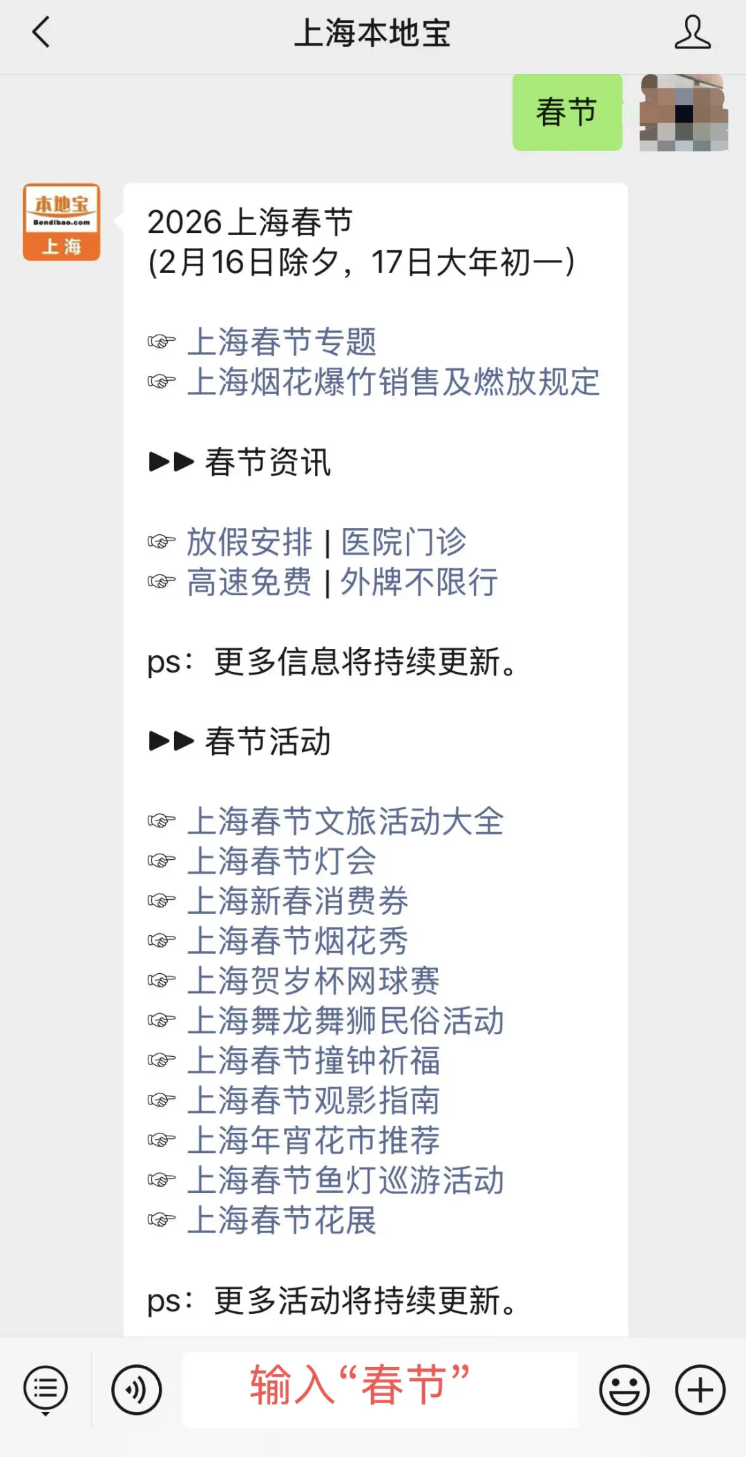 扫描下方二维码,关注上海本地宝,后台对话框回复【春节】查看上海春节活动全攻略:灯会、消费券、烟花秀、网球赛、民俗活动、赏花......(持续更新中)