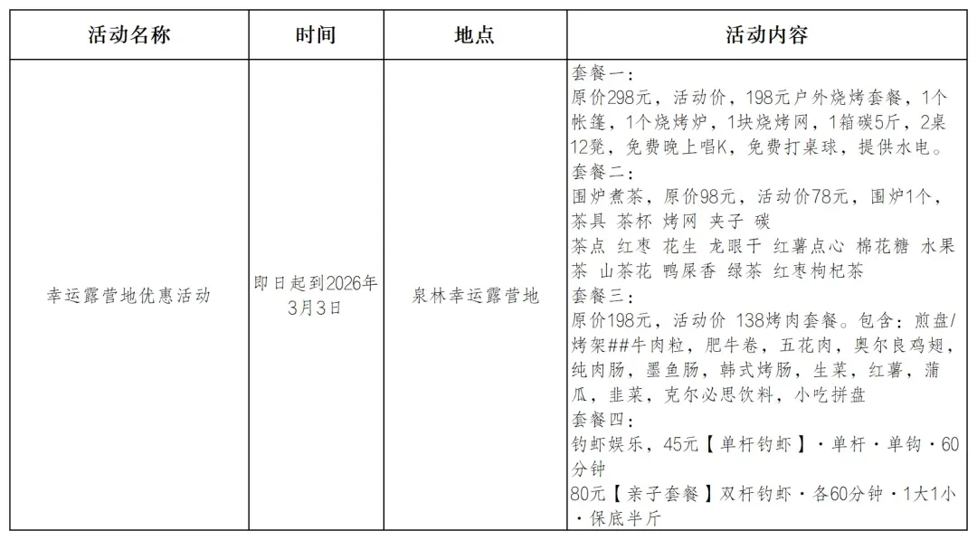 即日起至2026年3月3日,泉林幸运露营地推出多种优惠套餐,包含户外烧烤、围炉煮茶及亲子钓虾等项目,设施齐全,适合家庭或朋友小聚。欢迎前来享受一段悠闲的户外时光。