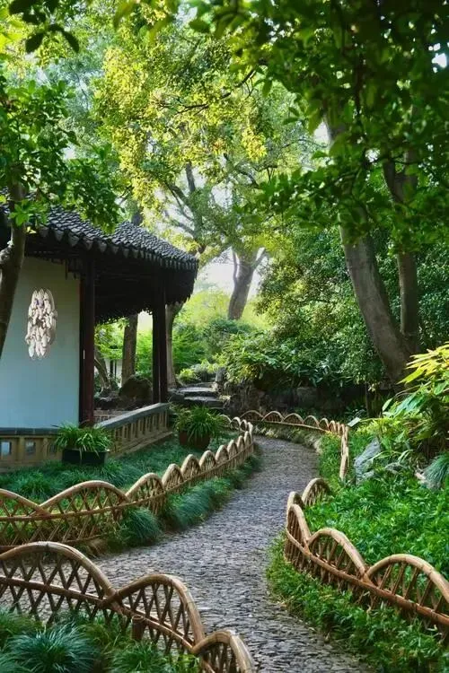 中间有小水面,廊桥一横,亭子一落,倒影就齐了。