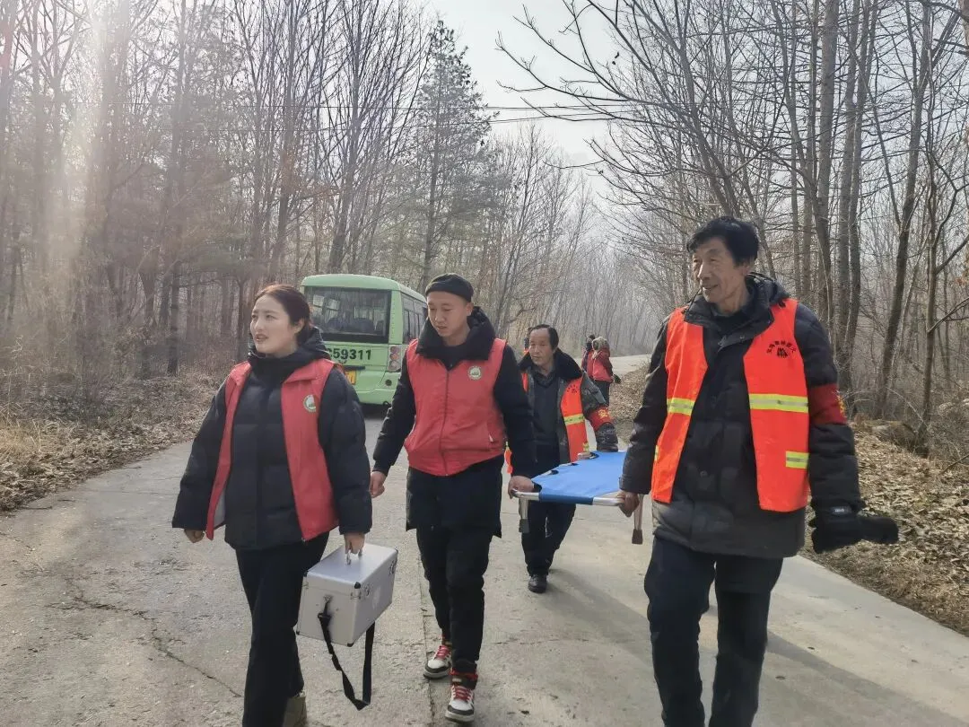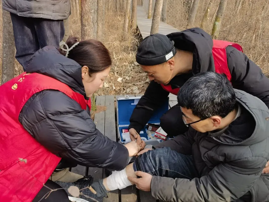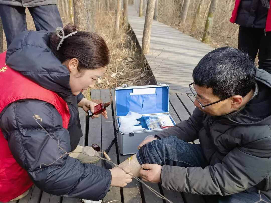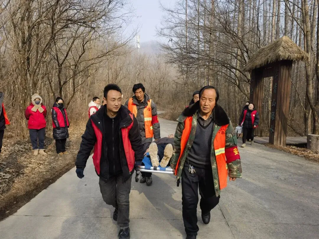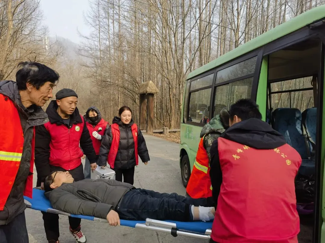 接下来,急救应急演练则围绕景区常见人员受伤场景展开,演练模拟接到游客求助电话后,景区应急指挥部第一时间启动急救响应机制。救治组迅速携带急救箱、担架等专业设备赶往指定地点,抵达现场后,工作人员快速定位伤者位置,遵循“先评估、后处置“的原则,细致询问、检查伤者受伤部位与伤情程度,随后规范开展消毒、喷药、包扎等应急救治操作。在确保不会造成二次伤害可移动的情况下,众人协同配合,平稳将伤者转移至担架,安全抬至应急车辆,全程衔接顺畅、处置专业,完整呈现了从接警响应、现场救治到转运衔接的全流程应急处置闭环。