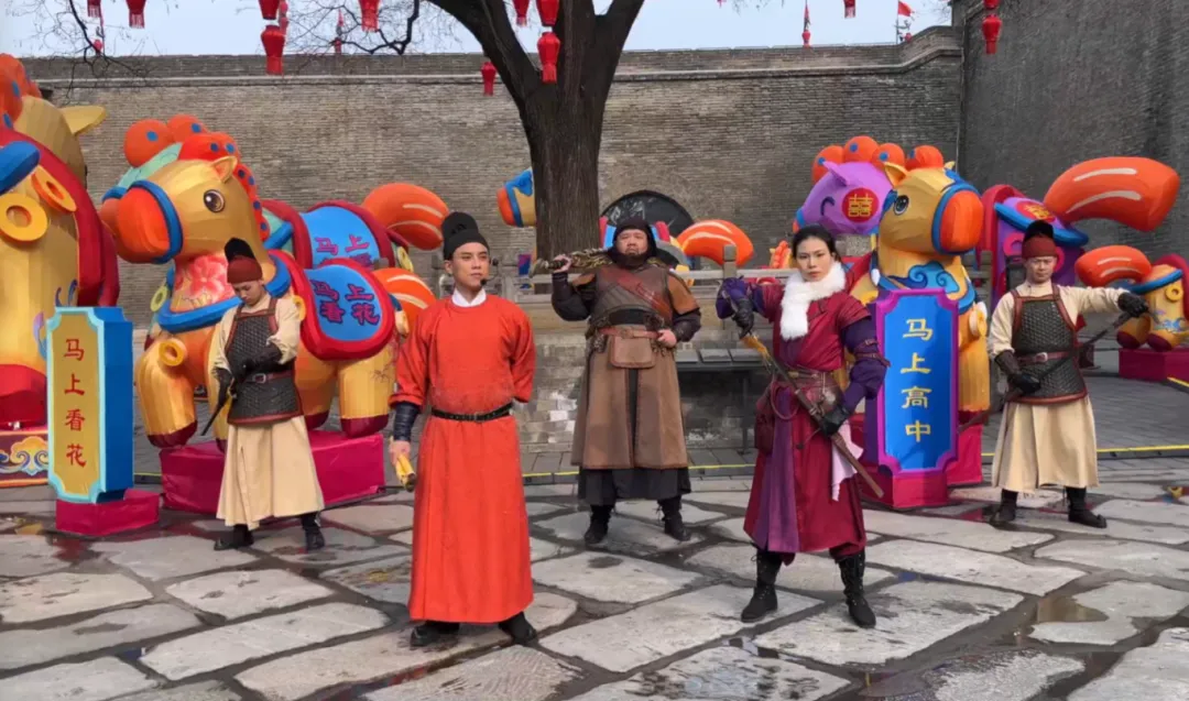 西安城墙上的“长安灯会”,是过年游览的最佳打卡背景,而穿行其中的演员互动,更是将您一秒拉近盛唐灯会现场。永宁门庆典广场,“朱雀将军”整装待发,身着铠甲,英姿飒爽;看似高冷的女侠,其实超配合合影。跟随女将军进入月城,“击鼓赐福”刚好开场,华服礼仪官会邀请游客上台击福鼓。