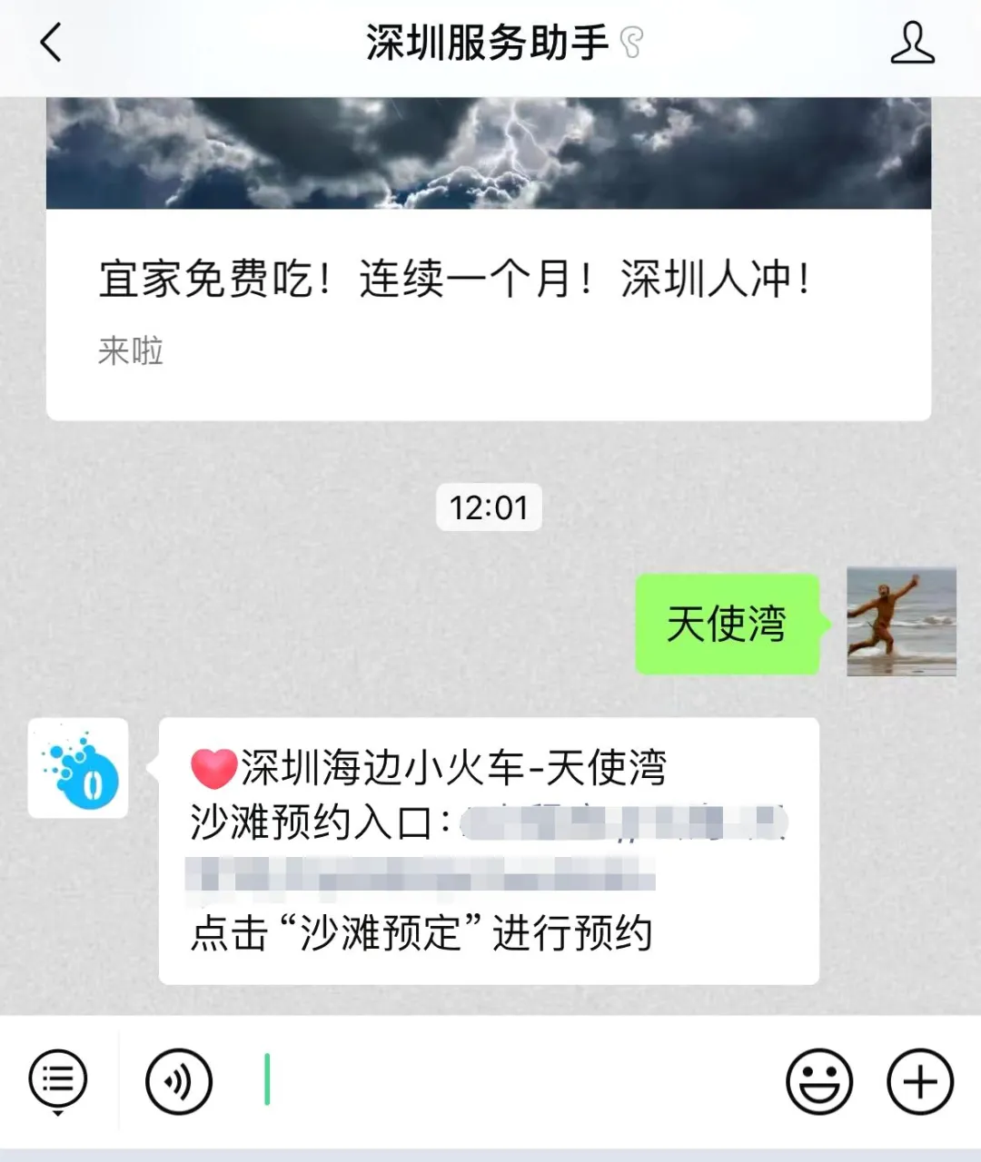 入口:点击【深圳服务助手】,进入后台聊天框发送关键词“天使湾”