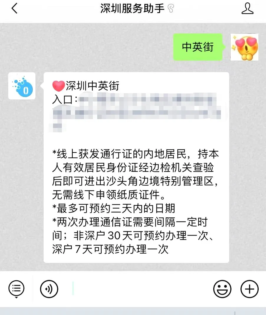 入口:点击【深圳服务助手】,进入后台聊天框发送关键词“中英街”