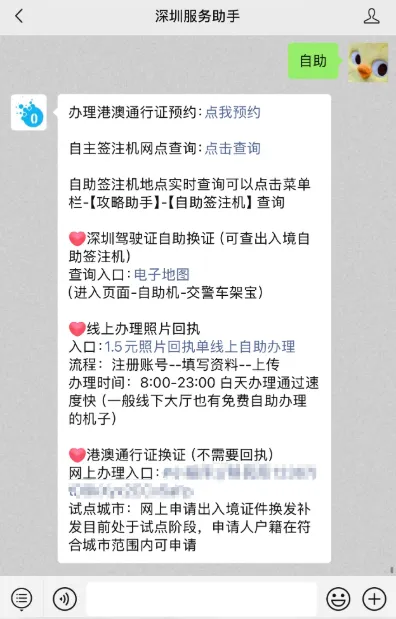 入口:点击【深圳服务助手】,进入后台聊天框发送关键词“自助”