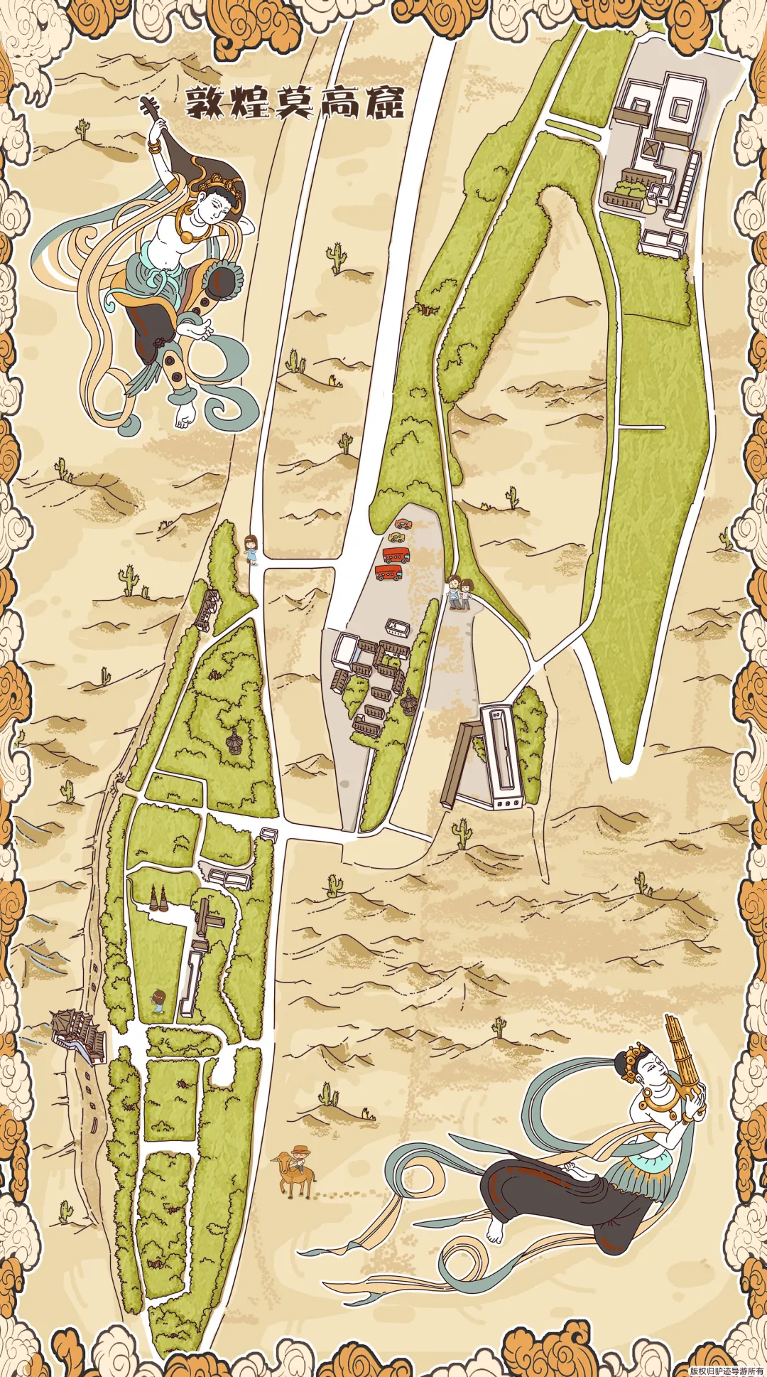 从敦煌市区出发,沿着G215国道向西行驶约25公里即可到达莫高窟。沿途可以欣赏到广袤的戈壁滩和壮丽的鸣沙山,感受大自然的鬼斧神工。