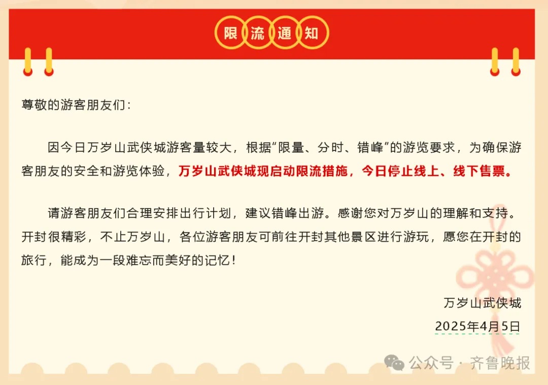 5日下午,景区再次发布通知:当天停止线上、线下售票。