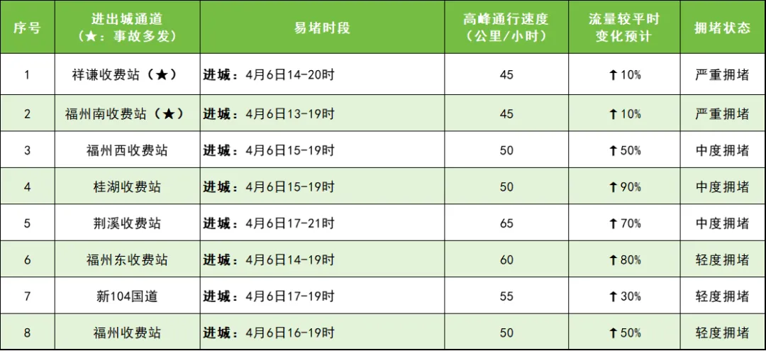 (一)祥谦收费站:进城方向4月6日14至20时较为拥堵,进城方向拥堵时,可选择经福州收费站出高速或从324国道绕行进城。