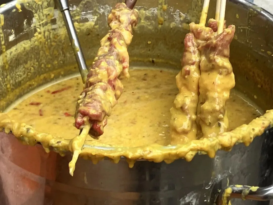 街尾的一家羊肉串点, 烤前要来点秘制调料。