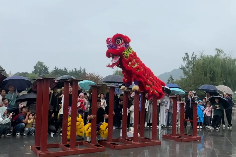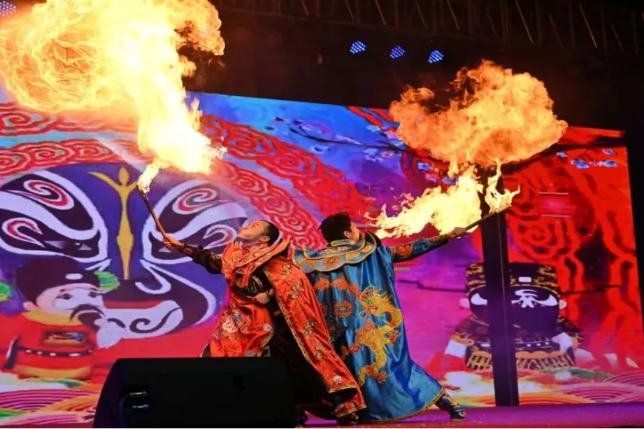 白天,古城变身一步一景的互动戏剧场:山河广场上演秦晋豫三地非遗展演,潼关古战船、晋南舞龙舞狮、安塞腰鼓轮番登场;