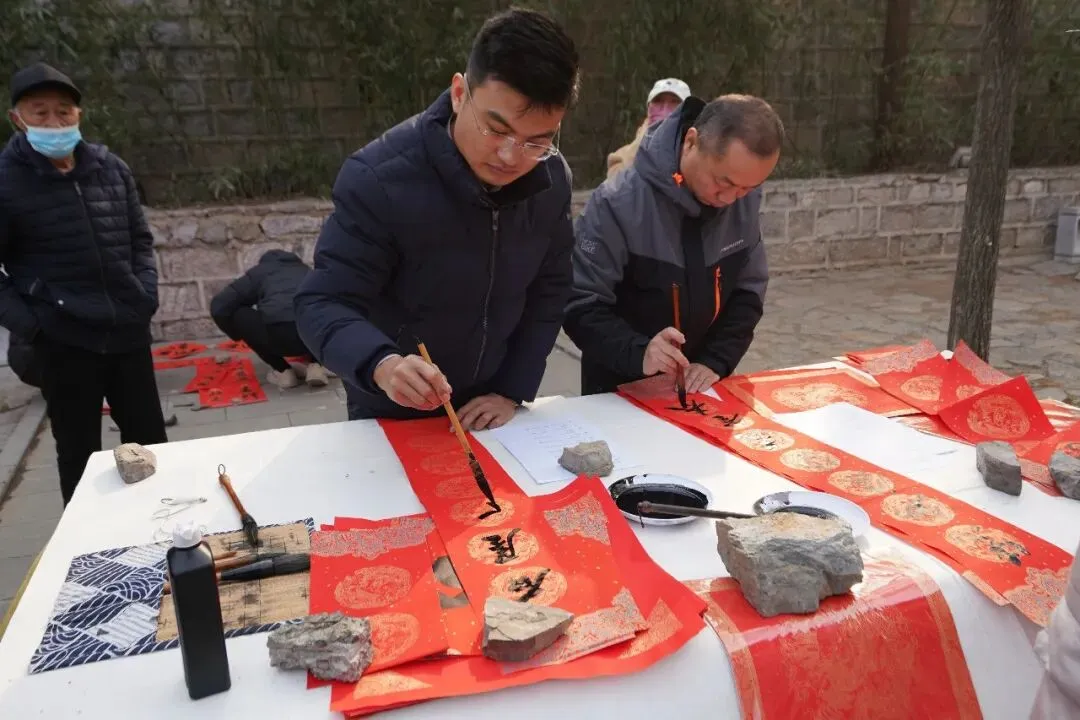 现场还开展了书画家送春联和书画活动。山东省书法家协会会员、山东省教育学会书法教育委员会副秘书长、济南大学产业教授、书法硕士研究生导师梁成立教授,山东省书法家协会会员、发展工作部委员,山东省青年书法家协会副秘书长,山东省文化馆馆员李同江,亲笔书写春联和福字,赠送给现场的乡亲们。同时,演出队还将一批省内老书画家作品送给朱家峪村的老党员、老战士、老支书、特困村民代表。浓墨落红纸,一笔一画勾勒出饱满的“福”,一撇一捺舒展成喜庆的春联,这不仅是笔墨馈赠,更蕴藏着书法家对美好生活的期许。
