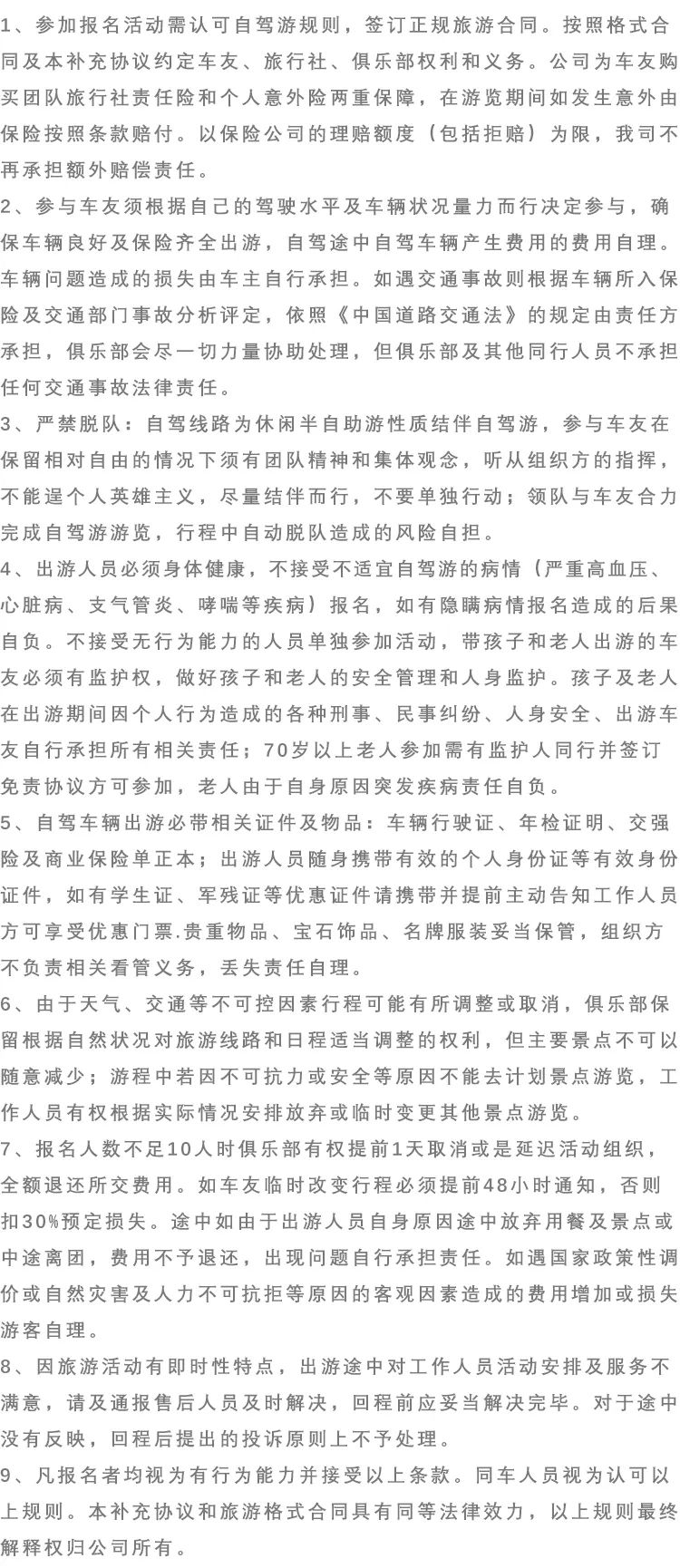 5.考虑到节日期间高速车流量较大,领队有权根据各景区人流量及交通状况进行适当调整行程,望车友予以支持配合,在保持游览景区不变的情况下特别对行程及行车路线进行了优化调整,以便更有利于游览!祝自驾一路顺风,开心出游,安全回家!