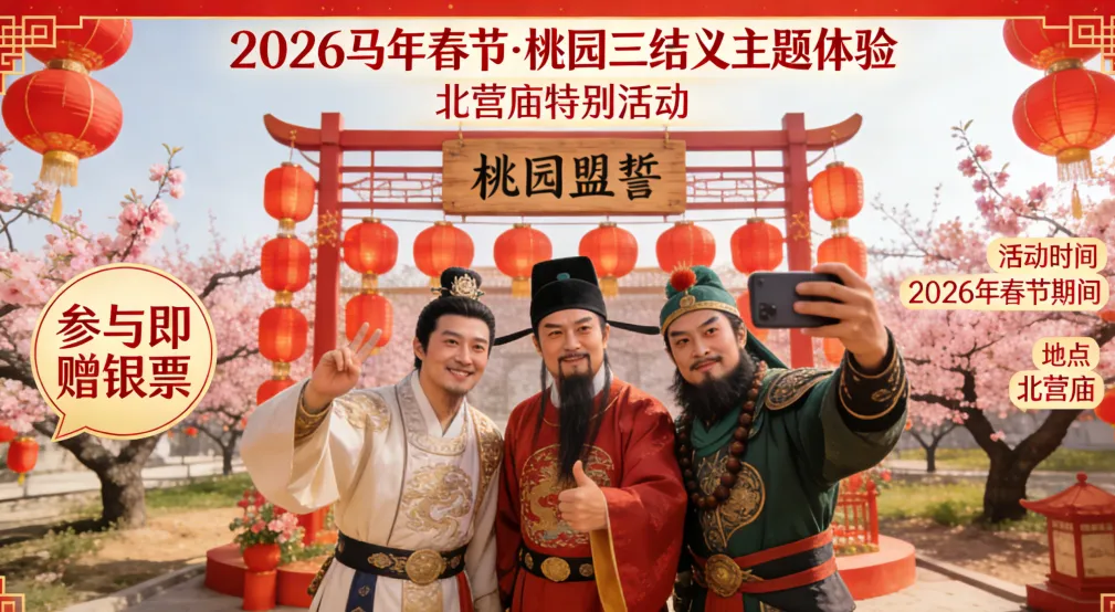 想和好友留下特别的春节记忆?来北营庙参与 “桃园三结义” 主题体验,穿上三国主题服装拍照,完成 “桃园盟誓” 仪式,就能获赠银票,见证珍贵的友情。