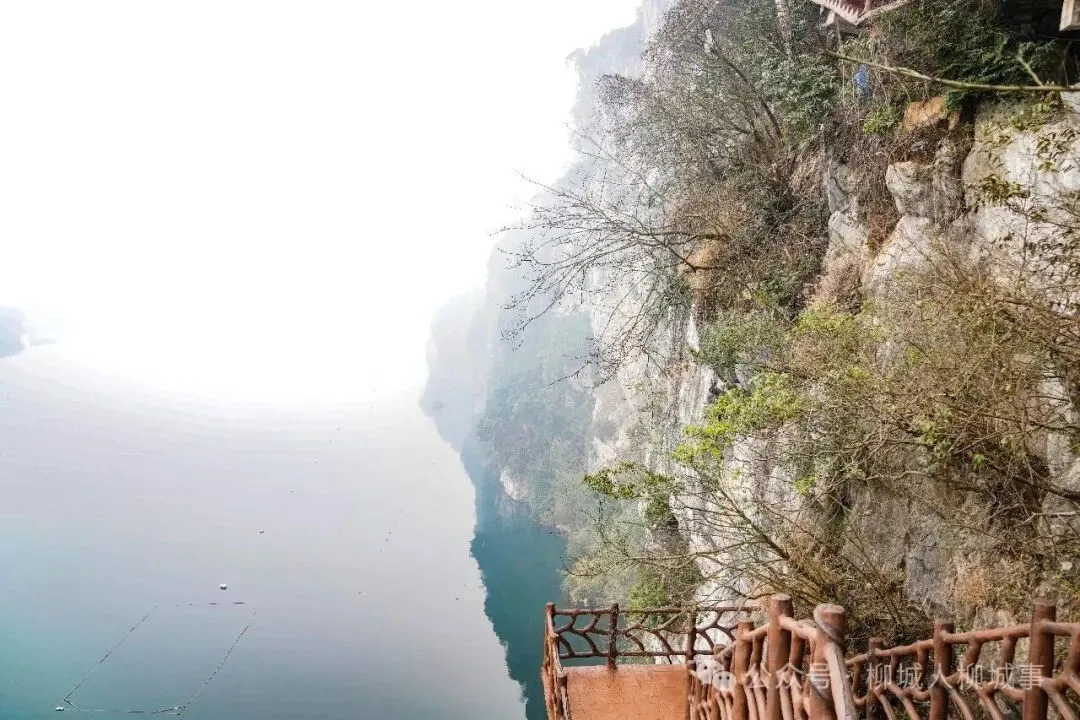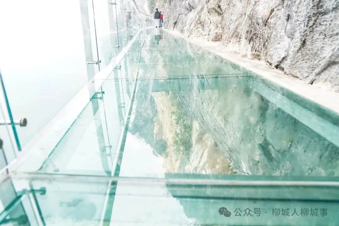 该玻璃栈道是景区600余米盘山栈道的核心部分,全长150余米,依山傍水而建,一侧临融江、一侧靠崖壁,游客置身其上可将融江山水美景尽收眼底,体验 “脚踩云端” 的观景乐趣;栈道两侧还贴心铺设40厘米宽水泥步道,兼顾恐高游客的游玩需求与安全体验。