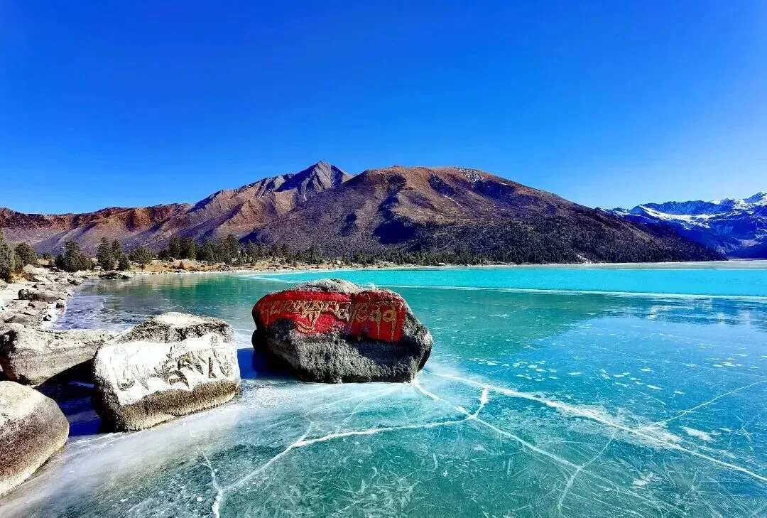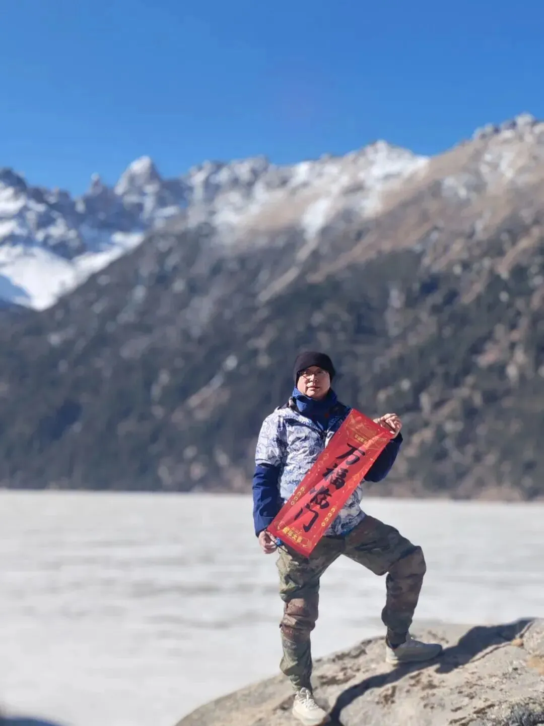 新春佳节,雀儿山群峰巍峨圣洁,玉龙拉措湖面凝结成大片澄澈蓝冰,阳光穿透冰层仿佛坠入琉璃世界。岸边古杉覆雪,风马旗在风中猎猎作响,与白塔相映成画,每一帧都是震撼人心的雪域童话。