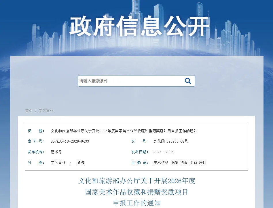 【政策快讯】文化和旅游部办公厅关于开展2026年度国家美术作品收藏和捐赠奖励项目申报工作的通知
