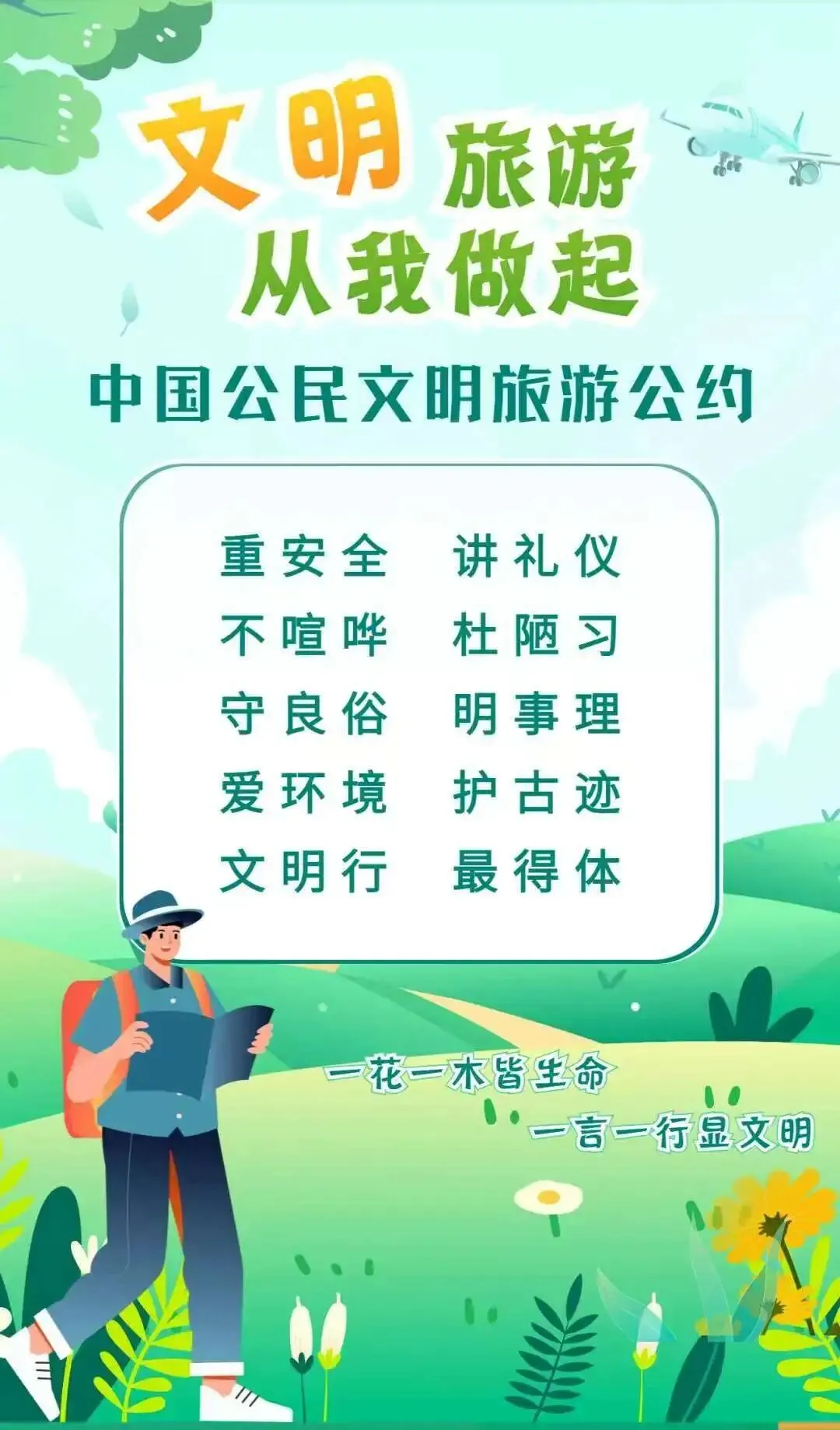 1. 遵守景区管理规定,不擅自进入未开放区域,不破坏文物古迹、生态植被,不在景区内刻画涂写,不采摘花草树木,不随意践踏植被;2. 遵守公共秩序,自觉排队、不大声喧哗,尊重他人游览权益,不影响公共环境,不损坏景区标识、座椅等配套设施,共同守护旅游服务资源;3.树立“绿水青山就是金山银山”的理念,敬畏自然、爱护环境。在旅游景区游玩时,不随地吐痰、不乱扔垃圾,将果皮纸屑、食品包装等分类投入垃圾桶,不在禁烟场所吸烟,践行“无痕旅游”。